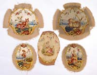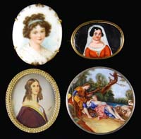FIVE MINIATURE PORTRAITS MOUNTED IN SIMULATED IVORY AND TORTOISESHELL SCRIMSHAWED FRAMES. Second quarter 20th century. The oval portraits of females in period costume within brass bezels mounted in simulated ivory and tortoiseshell veneered frames. SIZE: Largest: 4-3/4″ x 4-1/4″. Smallest: 4″ x 3-1/2″. CONDITION: All in very good condition, showing simulated wear and patina. 9-91165 (500-1,000)