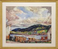 WILLIAM LESTER STEVENS (American, 1888-1969) INNER HARBOR. Watercolor harbor scene shows a river at the end of a harbor surrounded by buildings and hills. A large church is seen on edge of hill. Signed lower right “W. Lester Stevens”. Probably a northern Maine coastal scene. Housed in a gesso decorated gilt frame with white matte. SIZE: Sight: 17-1/2″ x 21-1/2″. CONDITION: Very good. 9-91337 (1,500-2,500)