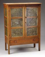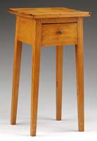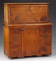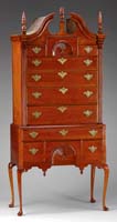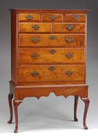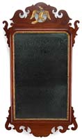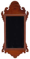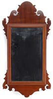 BENCHMADE CHIPPENDALE STYLE TIGER MAPLE MIRROR TOGETHER WITH A HANDMADE DOUBLE-HANDLE SPLINT BASKET. 20th century. The mirror with rectangular plate within a molded surround and scrolling eared crest and conforming apron. The splint woven basket of rectangular form fitted with a pair of bent carrying handles and a conforming pine lid. SIZE: Mirror: 35″ x 17″. Basket: 9-1/2″ h. x 21″ l. x 17″ w. CONDITION: Mirror, very good overall. Basket, in like-new condition. 9-90869 (200-300)