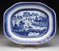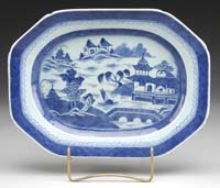 FINE MASON’S BLUE AND WHITE TRANSFER PRINTED JUG AND BASIN SET IN ORIENTAL PATTERN. The pitcher and bowl with faceted edges depicting a blue willow oriental panoramic view, each marked “Mason’s Iron Stone China”. SIZE: 11-1/2” h of pitcher, 16” dia of bowl. CONDITION: Very good overall with no chips, cracks, or repairs. 9-90577 (200-400)