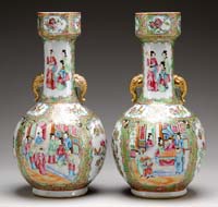 PAIR OF PARIS PORCELAIN GILT DECORATED AND PAINTED CAMPAGNA-FORM URNS, NOW MOUNTED AS LAMPS. Mid-19th century. Each with a flared leaftip rim above the body decorated with floral cartouches flanked by gilt branch-form, the pedestal decorated with cattails. Each mounted on a circular stepped plinth. SIZE: 11″ vase h. x 27″ overall h. CONDITION: Each with minor gilding loss, one with tiny chip on handle, otherwise very good. 9-91886 (400-600)