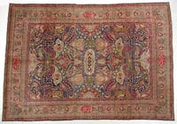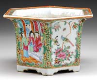 MISCELLANEOUS LOT OF SIX PIECES OF DECORATED PORCELAIN. 1) 6-3/4″ x 8-1/2″ dia. Sevres rose decorated bowl on ormolu stand, first half of the 20th Century. 2) 4″ h x 3″ dia. cigarette box with silver plated base rim and cover, cover having horseshoe and riding crop. Piece marked in the Homeward and The Hounds pattern. 3) 5″ Hutschenreuther figurine of boxing putti with original label. 4) 10-1/2″ Continental figurine of dancing woman, all over decorated with flowers. 5) Pair of 8″ covered jars decorated with exotic birds against a blue feather background. Cover with similar design and come on hardwood Oriental stands. – Both have cracks. CONDITION: As noted above, otherwise good. 9-91160 (300-400)