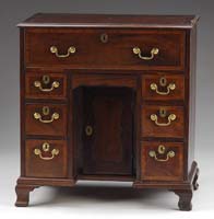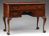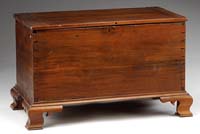 FINE BENCHMADE CHIPPENDALE STYLE MINIATURE BLANKET CHEST. Mid-20th century The rectangular molded hinged lid joined to the conforming case with mid-molding and bootjack ends. SIZE: 14″ h. x 20″ l. x 9″ d. CONDITION: Very fine overall. No restorations. 9-91574 (400-800)