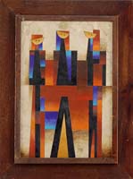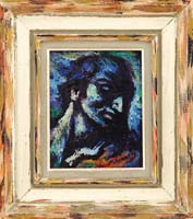 SOUTH AMERICAN ENAMELED ICON WITHIN A HAMMERED AND CHASED SILVERED METAL FRAME 19th Century. The oval enameled plaque depicting haloed Christ rising from the tomb, polychrome painted. Mounted in a conforming and scrolled floral molded frame headed by a sunburst. Indistinct hallmarks along frame base. SIZE: 7-1/4”h x 5-3/4”w. CONDITION: Overall good with minor wear to paint, frame with some creasing. 9-74607 (250-400)
