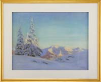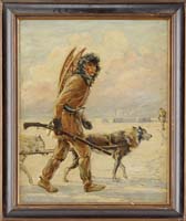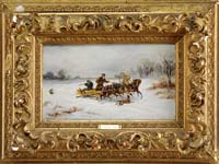 DONALD ALLEN MOSHER (American, 1945-) CAPE ANN BOATYARD IN WINTER. Oil on canvas winter scene shows a single mast red and white sailboat in wooden cradle alongside water with snow covered ground. Several colorful buildings are seen amongst the harbor under an early evening sky. Signed lower left. Housed in a fine carved and gilt frame which is stamped “Mosher Gallery 13 Main St. Rockport, Mass.”. SIZE: 16″ x 22″. CONDITION: Very good to excellent. 9-91276 (5,000-7,500)