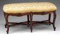 LARGE PORCELAIN FIGURAL GROUP. Group shows a man leading a horse with a double wagon seat saddle. An elegantly dressed woman and man sit atop the horse. Man with parasol and woman with basket of flowers. Horse is well mottled and stands on a naturalistic base with trees and stumps. Man is leading them to the side of a stairway for disembarking. Impress number “9642” on the side and an unidentified blue mark to base. SIZE: 13″ h x 15-1/2″ l x 7-1/2″ w. PROVENANCE: From a fine Bangor, Maine Mansion. CONDITION: Repairs and restoration. One finger missing. Otherwise good. 9-74216 (300-500)