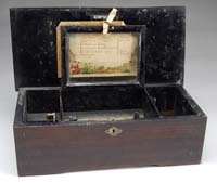 TWO JEWELRY BOXES AND FIGURAL DINNER BELL. 1) 5-1/2″ l brass turtle wind up dinner bell. By pushing down the turtles head, the tail moves and it rings. Marked “BOJ”. 2) 2″ h x 4-1/4″ w x 3-1/4″ d WMF decorated silver jewelry box. Top with a scene after a painting by E. Zamagois titled “La Demande En Mariage”. Bottom marked “OX” with the diamond WMF mark and “I/0”. Cloth lined and having its original key. 3) 2-1/2″ h x 3-1/2″ x 2-1/4″ small brass Victorian style jewelry casket. Rococo decoration with lions as legs and feet, scrollwork and lion head top. CONDITION: Very good. 9-744299-74430 (100-200)