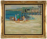 PAUL STRISIK (American, 1918-1998) “GLOUCESTER, MASS”. Oil on masonite beach scene shows a small sailboat at edge of beach with two figures. Seagulls fly overhead in a panoramic view of the shoreline including other sailboats. Signed lower left. Also signed, titled and dated “August 1964″ on reverse. Housed in its original silver gilt frame with linen and white liner. A gilt name tag attached to linen liner. Frame also having a Strisik stamp. SIZE: 12″ x 20”. CONDITION: Very good. 9-91596 (4,000-6,000)