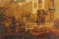 JOHN S. CAGGIANO (American, 20th Century) “A TOUCH OF GINGERBREAD”. Outstanding oil on masonite Cape Ann scene shows a Colonial home with large porch, fence with colorful flowers and flowering bushes. Signed lower left. Also titled and signed on reverse and dated “1995”. Housed in a fine carved and gilt wood frame. SIZE: 24″ x 20″. CONDITION: Very good to excellent. 9-91277 (4,000-6,000)