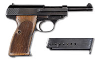 SN 3262. Cal. 7.65mm. Super rare Walther Mod HP in Cal 7.65mm, experimental trigger bar, single action only with target grips in factory correct HP shipping box. Standard configuration P38 with 5″ bbl having drift adjustable front sight and red painted rear sight. Left side of slide marked with the usual Walther banner followed by 2-line address that includes “Cal. 7.65 m/m” and suffixed by “Mod. HP”. Safety detentes marked with a white highlighted “S” and red highlighted “F”. Eagle/N marking on right side of slide, right side of bbl, and right side of locking block. Full SN under bbl, on slide, on right side of frame above trigger guard, with the last three digits repeated on the locking block. Fitted with wood target grips, each internally penciled with a matching “5/3262”, with stippling over the left thumb rest and deeply checkered panels on the left side with separate panels of checkering over the backstrap to extend over the right grip. Left side of Mag marked “P.38”. Major and minor components with original high polish salt blue, locking block in the white, grips with original varnish. When Warren Buxton wrote his P-38 books, he documented a serial range of 3105-3259. This gun obviously expands what is still a very, very narrow range of pistols. In fact, this may be the highest recorded SN for this type of gun. Regardless, according to Buxton, “The P.38 Pistol, Volume I”, pg 156, it is “An extremely rare and very difficult to find variation which generates intense collector interest.” Complete with an orig wood grain shipping box whose lid features gold image of Model HP pistol with “HP” at lower left corner and a Walther banner in the upper right corners. Includes orig cleaning tin, that has orig oil bottle and Walther marked hair swab, in addition to orig cleaning rod. PROVENANCE: The Esteemed Collection of Noted Expert and Author Warren Buxton. CONDITION: Outstanding with over 98% of salt blue on all components. Slight muzzle wear and a few pinpricks of oxidative wear on front strap. Excellent original mag. Dark grips with 80% original varnish showing small areas of wear, oil staining, handling marks. Mirror bore. Perfect manual mechanics. Crisp box, whose lid presents nicely with minimal separations. Equally high condition cleaning tin and cleaning rod. A fantastically rare P.38, in the correct shipping box, that could be the centerpiece of any collection. 52337-3 LMA (15,000-25,000) – Lot 2017