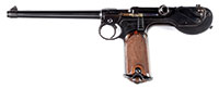 SN 380. Cal. 7.63mm. 7-1/2″ bbl. Frosted blue finish overall with 2-pc checkered walnut grips and numbers matching wood based magazine and buttstock. Borchardt leather holster with retaining straps attached to board stock and included is its hanging strap and magazine pouch holding one additional matching wood based magazine. Marked “SYSTEM BORCHARDT. PATENT.” on upper side of right receiver. Proofed Crown over B and Crown over U on bbl, receiver and toggle. Chamber crest marked “WAFFENFABRIK LOEWE BERLIN”. SN found on bottom of grip frame, trigger, toggle, stock lug and board stock. Detachable cheekrest is numbered to a slightly earlier carbine. Numbers matching stock is maker’s marked “GESETZUCH GESCHUTZT”. CONDITION: Good overall, with most blue finish having turned somewhat plum. Traces of nitre-blue evident on trigger and on protected areas. Bore heavily frosted with visible rifling. Mechanics are functional. Stock has numerous stains, blemishes and period minor scratches. Grips slightly worn and slightly oil-soaked, but solid and complete. Leather holster is intact but is basically a very supple relic, as is to be expected after being 110 years old. Magazine pouch is supple with good stitching. Both magazines retain most of their nickel finish and good solid numbers matching wood bases. Hanging strap is intact but not serviceable due to age. 52001-4 TDW (8,500-12,500) – Lot 2007