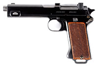 SN 1. Cal. 8mm Steyr. Very early production Steyr Hahn, the first pistol assembled in 1912, with modified frontstrap. Most features are as per standard production with 5″ bbl, fixed front and rear sight, and usual single line address: “Steyr 1912” followed by “MOD. 1911” and the large “S” at rear. Serial number “1” marked on left side of slide, immediately below on frame, behind the lanyard ring, and on the bbl along with a “K” inspection and an encircled “T”. Matching assembly number “3589” inside slide and on frame in front of hammer recess. An ergonomic extension has been added to the bottom of the frontstrap, the welded interface still evident, with the sides machined, seamlessly blending into the frame. Major components rust blued, now to include the trigger and hammer, likely applied when modifying the frontstrap. Strawed extractor, safety and screws. Checkered walnut grips, no markings on inner surfaces. CONDITION: Bright rust blue, 98+% coverage, with minor oxidation at front of slide/frame and slight discoloration at welded juncture on frontstrap. Comparable condition bbl, small parts and grips. Bright bore with strong rifling. Perfect manual mechanics. A very interesting, early production Steyr with modified frontstrap, probably by factory, serial number 1! 52581-1 (2,500-4,500) C&R – Lot 2015