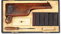 SN 463. Cal. 7.63. 7-1/2″ bbl. Deep rust-blued finish overall with a combination of straw and nitre-blue appointments. 2-pc finely checkered walnut grips with detachable shoulder stock with cheekrest, case including an unheard of four matching magazines, sling, holster, maintenance tools and barring block. This early Loewe Berlin manufactured pistol is numbered “463” on the bottom rear of magazine well, as well on the stock attaching iron, trigger, bolt toggle and on the bases of all four wood bottomed magazines. The SN is found as well on the board shoulder stock and cheekrest. Crown U and Crown B proofs are found on both bbl and receiver. System Borchardt patent is found on right side of receiver as well as Waffenfabrik Loewe Berlin on chamber. Shoulder stock has manufacturer’s mark of “GESETZLICH GESCHUTZT” with matching manufacturer’s mark on barring block. Fitted black leather case with nickel furniture is green velvet lined and houses the wiping rod, screwdriver, takedown punches, leather sling, grease container, solvent bottle and oiler. Leather holster is still strapped appropriately to board stock with strapping and buckle intact. CONDITION: Very fine overall with most rich finishes remaining, with slight muzzle wear and minor finish loss at connecting points from attaching shoulder stock. Nitre-blue has somewhat flaked on toggle cover plates. 2-pc checkered grips are spectacular with most orig varnish remaining. Straw finish on sear bar is still vivid while nitre finish on trigger, sear spring, screws and extractor remain very bright with over 70% nitre remaining. Magazines retain nearly all their fine nickel finish with only miniscule staining and loss on one magazine bottom. Shoulder stock is solid and complete with most of its varnished finish remaining, however, somewhat dulling. Several areas of bruising and abrasions exist, most prominently in the tensioning lug area and one screw is slightly fouled from the use of an improper screwdriver. Cheekrest is equally fine with one minor abraded area on rear. Leather holster, while being supple, all stitching has deteriorated and leather is somewhat alligatored. Shoulder sling exists as an example only, as the leather is well over 100 years old. is intact but would not retain strength enough to be usable. Tools and appendages are all excellent, showing minor storage and handling marks only. Barring block is exceptional. Leather travel case is quite fine with exterior having suffered slight distress on corners and soiling of green felt inside. All partitions are intact. Bore is bright with sharp rifling. Mechanics are crisp. A more complete or finer example would not easily be found. 52700-14 TDW (35,000-45,000) – Lot 2005
