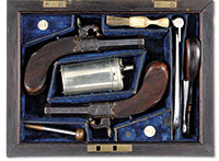 SN 4, 5. Cal. 38. 1-1/2″ Case hardened bbls and rounded boxlock percussion actions fitted with folding blued triggers and back sliding safeties, are engraved “C. MOORE 77 St. James’s STt London” (Charles Moore working at that address 1825-1842) on left sides, and with well cut large open scroll on right sides. Bottoms of breech sections are stamped with London black powder proofs, and serial/ assembly numbers “4” and “5” which are also on bbls. Bag grips with silver caps have very closely spaced checkering, and silver ovals at tops of grips. Pistols are housed in their orig rosewood veneered case, lined in blue velvet, and containing an array of fine accessories, including an unmarked German silver small sized combination powder/ cap/ and ball flask, polished steel nutcracker type ball mold, combination polished steel bbl and nipple wrench, brass and steel loading rod, ebony handled nipple wrench, and a bone handled dusting brush. PROVENANCE: Outstanding estate collection of Confederate and historical arms of Morris Racker. CONDITION: Excellent, very near to new, appears unfired, with only some slight oxidation in need of cleaning on inside of grip of gun “5”. Case is excellent with some chips and cracks in veneer. Interior cloth is fine with some rubs and losses. Accessories are excellent, with some stains and pitting on bullet mold. 51958-3 MGM (4,000-6,000) – Lot 3271