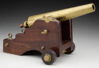 NSN. 15-12″ overall. 13-3/4″ overall including cascabel. Breech is crisply marked “L.T. SNOW / THE STRONG CANNON / M’F’R / NEW HAVEN CONN / USA”. Mounted on original brass mounted mahogany carriage. CONDITION: Very good overall. Firing pin cap appears to have been restored with a knurled end copper finial. Gun holds cock, locks and fires. Brass has a light mustard patina as do carriage mounts. Mahogany body is sound with scuffs and cracquelure to varnished surface. One brass bolt securing axle is missing. Matching assembly numbers to breech and tube. Carriage is numbered “32” on bottom. 52448-1 JS (4,000-6,000) – Lot 3263