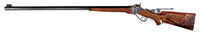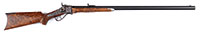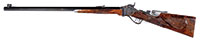 SN SCR 058. Cal. 45-70. . 32″ oct bbl with tunnel front sight and elevator tang sight. Case hardened action is beautifully scroll engraved with large gold inlaid moose on left and 4 well executed gold inlaid running buffalo on right, remainder of receiver is near full coverage scroll engraved. Checkered stocks are of straight grained walnut with orig full steel scroll engraved buttplate. Checkered forearm with silver tip. full case hardened action. Dbl set triggers. PROVENANCE: The Forrest G. Rhodes collection. CONDITION: Extremely fine, near new. Retaining nearly all orig finish to wood and metal, only scattered most minute handling marks noted. Bore is brilliant and shiny. Mechanics are crisp. 52470-14 JSL (2,500-4,000) – Lot 3257