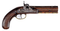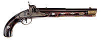 NSN. Cal. .45. 10-1/2″ oct to rnd rifled bbl with engraved bbl tang. Curly maple stock with 14 silver inlays and an oval silver wrist inlay engraved “RB”. Engraved brass buttcap, trigger guard, rear ramrod pipe, and nose cap. James Bown is listed as a gunsmith in Pittsburgh from 1848 – 1887 and marked his guns James Bown & Son after 1847. CONDITION: The pistol is in very good shape, the name on the lock is worn to the point that it is hard to read and there are only remnants of the signature on the top flat of the bbl. The bbl appears to have been refinished.Mechanics are good as is bore. 52594-3 RGG (2,000-3,000) – Lot 3275