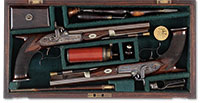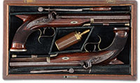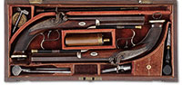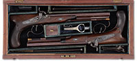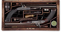NSN. (1829) Cal. 43. 9-1/2″ Octagon bbls with hair “rifling” are unmarked. Breech plugs have platinum bands. Back locks are nicely acanthus engraved and are also engraved “P. Vallee” “Phila” (working at South 2nd Street 1829) on tails. American walnut saw-handled half stocks have horn tips and checkered bag grips. Furniture is of iron. Trigger guards have finger spurs and pineapple finials. Triggers are set. Pistols are housed in a mahogany case lined in blue velvet, which contains some accessories. CONDITION: Excellent. Bbls retain most of their orig brown, locks and breech iron have most of their case color. Trigger guards have traces of blue. Stocks retain most of their orig finish with numerous light marks. One gun has a crack at forend running through escutcheon. One lock will not cock. One trigger won’t set. These guns are “as found” and undoubtedly need a good cleaning. Pistols fit case perfectly. Exterior of case has been refinished. Interior cloth is good. 52674-7 MGM (7,500-9,000) – Lot 3264
