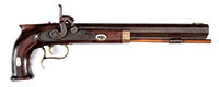 Cal. .30. 5″ full oct, unmarked bbl. Curly maple stock, iron backstrap and trigger guard with brass buttcap and nose cap. This unusual pistol is designed to shoot 2 loads from one bbl using 2 locks and 1 trigger. Multiple shot pistols of this type are very rare. CONDITION: Very good with a small amount of wood filler between the trigger and rear of lock on left hand side. The grip was checkered but has nearly been worn off. Mechanics function. 52594-39 RGG (1,500-2,500) – Lot 3279