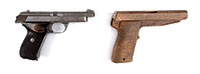 1) PROTO TYPE OLYMPIA PATTERN. NSN. Cal. .22. Prototype or toolroom developmental mock-up believed to be of the Erma or Walther Olympia pistols. 4-1/2″ bbl, exposed hammer sgl action operation with 10 rnd mag capacity. Firearm is in the white and very crudely resembles the exposed hammer variation of the 1936 Olympia. PROVENANCE: Session two of the extraordinary Warren Buxton Collection. CONDITION: Typical toolroom example having never been finished with many machine marks and was probably strictly a composite example for pre-production development. Obviously, not a functioning firearm thereby sold “as is”. 2) Walther Prototype. SN nsn. Walther wooden toolroom or patent model mock-up believed to be for the development of the P-99 type pistols being internally striker fired and obviously dbl action design. Wooden patent models are of the rarest of all collectibles in the developmental studies of firearms. Made of hardened maple, measuring 8″ overall l and 5-1/4″h. Obvious design for a dbl stack mag in the 12-15 rnd range depending on diameter. Several small non-ferrous metal components exist inside such as a bbl trunnion and trigger guard pin. PROVENANCE: Session two of the extraordinary Warren Buxton Collection. CONDITION: Very fine with wood having been very heavily dried in a possible kiln. Very fragile due to its construction and is missing one grip screw in base. 52342-152, 52342-174 TDW (1,000-1,500) – Lot 2391