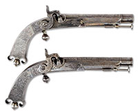 NSN. Cal. 50. 9-1/2″ Twist octagon bbls. Guns are numbered “1” and “2” on bright polished breech plugs and irons. Irons have rear sights. Island bar locks with tall serpentine sculpted hammers have rebated tails, and are engraved “Pondevaux St. Etienne” (working 1845 – 80). Dense European walnut half stocks with long fluted grips, have relief carving at forend tips. Pistols are bright polished iron mounted. Trigger guards with spurs, are relief engraved “G B C” (?) on bows. Butt caps are nicely filed. Pistols are housed in their orig walnut case lined in green cloth, which is french fitted for pistols and a fine array of orig high quality accessories including brass loading rod, steel bullet mold, ebony handled lead pouring ladle, ebony loading mallet, and a very fine Dixon and Sons small copper bodied bag flask. CONDITION: Excellent, very close to new, possibly unfired, retaining nearly all their bright polish and with only a bit of silvering on sharp edges of bbls through their orig brown. Case is good, lid has cracks, and is warped. Interior cloth has some insect damage. Accessories are excellent, still bright. 52632-16 MGM (4,500-7,500) – Lot 3395