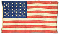 This flag is in beautiful condition, measuring 51″ on hoist and 86″ on fly. Flag is totally hand-sewn of red, white and blue single-ply wool bunting with 35 double applique 3″ cotton stars in an unique canton configuration not seen before. 1-1/4″ canvas hoist has 3 hand-whipped eyelets and Philadelphia maker’s mark “M BRIGGS / 314 SOUTH 4TH ST / PHILA”. The 35th star commemorated the entry of West Virginia as the 35th state July 4, 1863 and was only official for one year. This is the rarest of star configurations during the Civil War. PROVENANCE: Ex-George Kegerreis Collection, Harrisburg, PA, 2009. CONDITION: Very good overall, good colors, light staining, fraying and scattered small reductions unaffecting aesthetics. Old repairs contemporary to time of use. This flag saw some use but was well cared for. 52569-1 JS (6,000-8,000) – Lot 3437