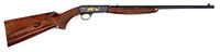 SN 07200N2646. Cal. .22 LR. 19-1/4″ bbl with blade front sight and flip-up rear sight, left side of bbl marked with Japan manufacture. Full knob pistol grip buttstock checkered in 2-point pattern with steel lined buttplate. Checkered forearm. Receiver is nicely engraved with gold dog chasing rabbit on left, gold dog bust on top, gold fox chasing squirrel on right, all surrounded by floral engraving. Gold plated trigger. All visible SN’s match. PROVENANCE: The Forrest G. Rhodes collection. CONDITION: Very fine, as field used. Retains approximately 95% overall finish, wood with scattered light scratches and field use hunting bumps. Bores is excellent. Mechanics are fine. 52470-25 JSL (1,000-1,500) – Lot 2607