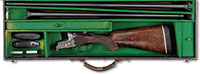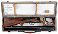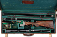 SN 223. (1935) Cal. 12 ga. 26″ and 30″ Demi-bloc bbls are mounted with matted ventilated ribs, dyed red ivory front beads, ivory mid-bead on one, rear portion of ribs gold inlaid “Tell de Luxe”. Rear portions of bbls are nicely engraved with shaded acanthus, and are marked “KRUPP STEEL”. Bottoms of bottom bbls are stamped with imperial German nitro proofs for 2-3/4″ chambers, with proof date of Jan. 1935. There is a gold inlaid family crest on bottom of each rear lump. Case hardened scallop-backed, boxlock double Kersten OU action features automatic safety, bushed strikers, and single selective trigger. Action is engraved with near full coverage exceptionally well cut and finely shaded Germanic type scrolling acanthus. This very fine work surrounds vignettes of game on sides of action, major subjects of which are flush gold inlaid and nicely detailed; pair of mallards flushing from marsh on left, and a trio of quail in open grassland, on right. “T. N. Tell & Sons Germany” is on long band under duck scene. Steel trigger guard with relief engraved vignette of hawk stooping on flushing pheasant, is on trigger guard bow, and tang is engraved “A. H. Heinen” “Importer – Chicago”. Well marbled and figured dark European walnut steel capped pistol grip buttstock measures 14-1/4″ over soft solid black pad with aluminum base plate. Side panels are checkered and have nicely shaped drop points. Closely spaced grip checkering is of fancy pattern. Steel grip cap is nicely engraved and has initials “HB” gold inlaid. Three piece ejector forend has bottom section which services both sets of bbls, which has Deeley release. 26″ Bbls: Bore diameter: top -.724, bottom – .724. Bore restrictions: top – .003 (IC), bottom – .020 (mod). Wall thickness: top – .026, bottom – .030. Drop at heel: 2-1/2″, drop at comb: 1-7/16″. Cast about 1/2″ on. Weight: 7 lbs. 7 oz. LOP: 14-1/4″. 30″ BBLS: Bore diameter: top -.724, bottom – .724. Bore restrictions: top – .047 (extra full), bottom – .049 (extra full). Wall thickness: top – .029, bottom – .032. Drop at heel: 2-1/2″, drop at comb: 1-7/16″. Cast on 1/2″. Weight: 7 lbs. 12 oz. LOP: 14-1/4″. What is most likely orig leather covered metal case with nickel-plated riveted on corners, central rectangle on top, is lined in green cloth, has space for gun and extra bbls, and contains Powers brass cleaning rod with turnscrew and oil bottle in handle, pair of snap caps, and a shorter leather covered pad insert, along with a steel buttplate. CONDITION: Very fine to excellent. Bbls retain over 90% of their orig blue with a few marks and some flecking. Action retains perhaps as much as 30% orig color, engraving still sharp and clear. Stocks retain most what appears to be their orig finish with numerous marks and bumps. Rear portion of butt had light refinish at time of installation of pad. Checkering lightly worn, and somewhat gummed. Front portion of pistol grip has piece added to change angle of grip. Bores are excellent. Action is tight. Ejectors are strong and in time. Trigger appears to work well. Case leather is considerably deteriorated with top grain chipped away in many areas. Handle is good. Interior cloth is good, with some bleaching, rubs through, and staining. Accessories are good. A very high quality gun, especially made for the American market, to do double duty for skeet and trap. Special Note: This item(s) contains plant or animal properties that may be covered by the Endangered Species Act (ESA). Please read the Conditions of Sale, section 15, for more information regarding the Endangered Species Act, and your responsibilities as a buyer. 51872-69 MGM (6,000-7,500) C&R; ESA – Lot 1691