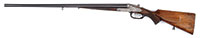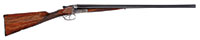SN 1897. (ca 1896) Cal. 16 ga. 2-1/2″ Chambers. 26″ Dovetailed steel bbls are engraved “Charles Daly Diamond Quality” on unmatted portion of concave matted game rib. Rear portions of bbls are engraved with 2″ triangles of nicely cut scroll and with scroll flanked Witten Excelcior Steel logos. Bbl flats are stamped with German black powder proofs. Bottoms of bbls with steel markings are also stamped with “HAL” crossed pistol logos denoting manufacture by Lindner. Case hardened arched back boxlock action with square crossbolt third fastener also features automatic safety (SAFE inlaid in gold), pin type cocking indicators, side clips, and dbl triggers with checkered finger blades. Fences are nicely filed, and action is engraved with 80% coverage very well cut closed, shaded scroll which surrounds interesting game scene on bottom of the action depicting a trio of game birds, standing in foreground, with another member of the group flying in from background. “CHARLES DALY” is in very small letters at rear circumferences of fences. Case hardened trigger guard has scene of two snipe on bow with SN on tang. Dark marbled and stump figured European walnut round knob pistol grip buttstock measures 14-1/2″ over old, most likely orig, Silver pad with brown leather facing. Stock features typical Daly styling with checkered side panels, elongated drop points, and point pattern checkering at grip. Tip of grip has inlet horn oval with central raised rib. A vacant silver oval is on toe line. Matching splinter ejector forend with inlet small horn tip has Deeley type release. Bore diameter: left -.673, right – .673. Bore restrictions: left – .030 (full), right – .008 (IC). Wall thickness: left – .026, right – .026. Drop at heel: 2-15/16″, drop at comb: 1-3/4″. Neutral cast. Weight: 5 lbs. 11 oz. LOP: 14-1/2″. CONDITION: Excellent, as found. Bbls retain over 90% orig lustrous blue, with a number of scratches, some fairly heavy, especially toward muzzle on left bbl. Action retains approx 80% orig case hardening color, pleasingly silvered on high edges and thinning around bottom from normal hand wear. Stocks retain 80 – 90% orig hand rubbed oil finish with numerous marks, both light and heavy. Checkering lightly worn. Bores are excellent, with a couple of light pings, corresponding to marks on exterior of bbl. Action is tight. Left ejector is “live” and fires when forend is removed. Some wood is missing from interior of forend in loop mortise. A fine example of this relatively scarce Charles Daly. 52580-1 (8,500-12,500) – Lot 1693