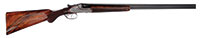 SN 480801. Cal. .410. 3″ Chambers. 28″ Shoe lump bbls are engraved “No. 13 of 100” on matted game rib. Importer, makers name and “MADE IN GERMANY” are on side of left bbl, with side of right bbl engraved “360 SL .410 GA”. Bbl flats are stamped with German proofs for 3″ chambers. Coin finished petite frame sidelock action features non-automatic safety, crossbolt third fastener, bushed strikers, raised rib tumbler end cocking indicators, and dbl triggers. Action is engraved with 60% coverage sprays of semi-relief scroll with some wiggle and geometric borders. Lockplates are engraved with semi-relief game scenes; a fox sneaks up on a trio of ducks on left side, and a pair of dogs, one retrieving a rabbit, while another rabbit escapes, on right. Fox scene is signed by the engraver “S. S” (Sebastian Scheersmidt). Top lever and trigger guard are blued, and also scroll engraved. Well marbled European walnut straight grip buttstock measures 14-1/2″ over composition Merkel buttplate, and features point pattern checkering on diamond hand. Matching splinter ejector forend has Deeley release. Bore diameter at muzzles: left -.400 (mod), right – .400 (mod). (label marked mod and full) Drop at heel: 2-5/8″, drop at comb: 1-7/16″. Cast about 1/4″ off. Weight: 5 lbs. 14 oz. LOP: 14-1/2″. Gun comes with its orig green and white Merkel box with end label with all pertinent information for this gun. Box contains packing materials. CONDITION: Excellent, very near to new, essentially all orig metal finish intact with some handling and assembly marks. Stocks have a number of light marks and scratches overall, mostly on butt. Mechanically excellent. Box is excellent. 51937-1 MGM (7,500-12,500) – Lot 1684