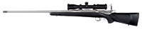 SN JB-1. Cal. .338 REM ULTRA MAG. 28″ ported metallic matte finished bbl. Black composite checkered buttstock with sling swivels and black “Borden Rimrock” pad. Mounted with Swarovski 1.5-6X-42 Habicht scope. WEIGHT: with scope, 8 lbs, 15 ozs. PROVENANCE: The Forrest G. Rhodes collection. CONDITION: Very fine, as field used. There are minor losses behind top of receiver and buttstock, and some minor staining to bbl. Bore is bright and shiny. Optics are clear. Mechanics are fine. 52470-24 JSL (2,000-3,000) – Lot 2747