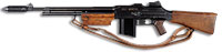 SN 00139. Cal. 30-06. 27″ bbl with flash hider. This is a USGI parts kit with undated NE-7 (New England Arms Co.) marked bbl. Early WW2 Era composite buttstock with flip-up shoulder rest and provision for monopod as well as walnut forearm on a Group Industries registered receiver. The receiver SN is the only serial numbered part, with national stock numbers on magazine and trigger group. This is in the classic 1918A2 configuration, with slow and fast rate automatic fire only (attractive model for Connecticut collectors) with typical flash hider and bipod. It incorporates the most improved and latest style gas regulator nut which can be turned by hand to adjust the size of the aperture, which routes gas to the operating piston. It includes 1 original 20-rnd magazine. This is a National Firearms Act item and requires BATF approval prior to transfer. This item is fully transferable on an ATF Form 3 or 4. CONDITION: Overall appearance and finish is extremely fine as refinished upon re-manufacture in a gray Parkerized finish on gun parts except for gas regulator, which is mostly devoid of finish. Black enamel finish on bipod only. Mechanics are crisp and positive. Bore is fine with strong rifling. Mostly bright with some darkness in the groove. Browning Automatic Rifles machine guns are always popular at the range and this is a fine opportunity for any Class III enthusiast. The steady thump, thump of the Browning automatic rifle is unmistakable to any who have heard it.