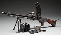 SN BB8559. Cal. .303 British. 21-1/2″ bbl. Bren Mark I marked “MK I. / 1943” on left side of receiver. External SNs do not match as bbl is numbered “BD17079” as well as “FB234”. Bbl is also marked “MK I*”. Bbl retention latch matches receiver SN. Includes two 30 rnd mags and one spare bbl. British broad arrow proofs are present. Left side of receiver is engraved “JPL T AZ85653”, which indicates that at one time this arm was in the possession of a noted firearms enthusiast in Arizona. This is a National Firearms Act item and requires BATF approval for transfer. This item is fully transferable on an ATF form 3 or 4 as Curio & Relic eligible. PROVENANCE: The class III weapons formerly on loan to Evergreen Aviation & Space Museum. CONDITION: Overall finish and appearance is fine with over 90% of black enamel reapplied vintage finish on receiver over orig blue finish chipping in places with some small spots of bare metal right below bbl. Bbl also has a coating of black enamel over its orig blue finish. Wooden carrying handle is of an attractive brown color and has dings and handling marks. Hand grip has only a few slight dings. Buttstock has been sanded and refinished and exhibits an attractive straight grain. Some slight pitting visible in places underneath reapplied finish. Gas port behind bipod shows evidence of firing yet action is extremely smooth. Mechanics are crisp. Bore is very good with shiny lands and grooves with some slight pitting. Spare bbl is fine, with strong bright bore, extremely fine enamel finish, and clean gas port. A good solid example of a hard to find C & R eligible WWII British Bren gun. 52608-2 JWK (25,000-30,000) C&R – Lot 2104