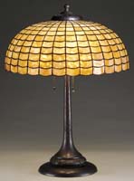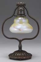 TIFFANY STUDIOS & QUEZAL LAMP. Adjustable three armed bronze base has four cat’s paws surrounding a center stem all on a circular footed base. Finishing this lamp is a domical art glass shade decorated with a hooked feather and chain design in yellow on a white ground. The lamp is finished with a pierced top cap. Shade is signed “Quezal”. Base is signed “Tiffany Studios New York 427″. SIZE: Shade has 2-1/4″ fitter x 7″ dia. Lamp is 15-1/2”. CONDITION: Very good to excellent, shade and base are a marriage. 5-61479 (2,000-3,000)