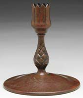 TIFFANY STUDIOS ARTICHOKE STAND. Bronze stand of candlestick form is decorated with an artichoke stem and plain inverted saucer foot. This stand is used to support a Tiffany favrile glass vase. Stand is signed on the underside “Tiffany Studios New York 1043”. SIZE: 5″ t. CONDITION: Very good with minor oxidation and color variation. 5-62154 (300-500)