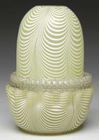 TIFFANY STUDIOS PASTEL CREAMER. Very pretty Tiffany creamer has bright yellow interior shading to clear. Foot and body are further decorated with vertical panels of white opalescence with a shaded opalescent band surrounding the outer edge of the creamer. Signed on the underside “LCT Favrile 1917”. SIZE: 3″ t. CONDITION: Very good to excellent. 5-63679 (400-600)