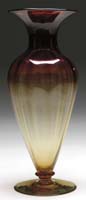 FOUR ART GLASS VASES. Interesting group of vases includes a mottled brick red glass vase with stone type pattern, a translucent green vase with internal decoration of swirling diagonal lines and a center wave pattern with areas of pink highlighting, a King Tut pattern vase with gold iridescence having green outlining against a cream colored background and a gold and purple iridescent zipper pattern against a light green background. Each vase carries what we feel is a spurious LC Tiffany Favrile signature and two of the vases also have Tiffany paper labels. Dorothy-Lee used these as examples of added signatures in the marketplace. SIZE: Tallest is 9-1/4″. CONDITION: All are very good to excellent. 5-63732 (200-400)