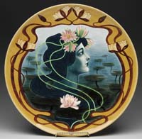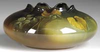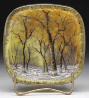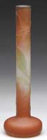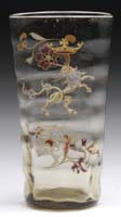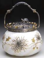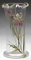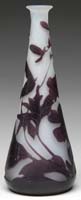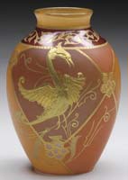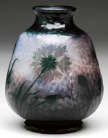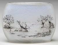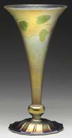 CAMEO AND SILVER BOWL. Very interesting cameo bowl features green cameo latticework design with rose stems and buds surrounding the vase. Vase is further decorated with wheel-carved lavender flowers all set against an acid textured slightly opalescent background. Flowers, leaves and stems are highlighted with gold gilding. Rim is finished with a silver band with matching rose, stem and leaf design. Bowl rests on a silver foot. Bowl is signed on underside of glass with etched signature “L.C. Tiffany Favrile” while the silver foot is engraved “Louis C. Tiffany/Laurelton Hall”. While we have never seen this type of work from Tiffany, we cannot say for certain it was not an experimental piece or a gift, for that matter, to Tiffany at Laurelton Hall. We will leave that decision to you. SIZE: 7″ t. PROVENANCE: From the Collection of Dorothy-Lee Jones. CONDITION: Very good to excellent. Silver foot appears to have been reapplied. 5-63846 (500-700)