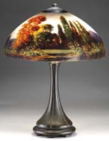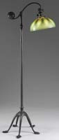 TIFFANY STUDIOS DAMASCENE FLOOR LAMP. Very nice Tiffany floor lamp has bronze counterbalance base with medium brown patina. Base supports a green damascene shade with platinum iridescent waves with strong blue highlights. Shade is signed on the inside of the fitter “LCT Favrile”. Base is signed on the underside “Tiffany Studios New York 677”. SIZE: Shade is 10-3/8″ dia. Lamp is 53″ t. CONDITION: Very good to excellent. 5-63632 (12,000-15,000)