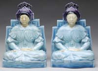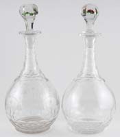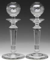 PAIR OF LACE MAKER TYPE WHALE OIL LAMPS. This pair of lamps are blown and hand cut. The bases show a polished pontil, stems are facet cut where as bulbous tops are cut with circles around circumference. They are of American or European origin. Both lamps carry Dorothy-Lee Jones Collection stickers on the underside. SIZE: 11-1/2″ t x 5″ w at base. PROVENANCE: From the Collection of Dorothy-Lee Jones. CONDITION: Very good to excellent. 5-63118 (700-900)