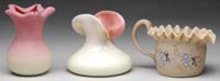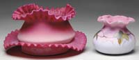 TEN OPALESCENT & WHITE CUP PLATES. 1) Lee #89 plate. Opalescent with baskets of long pendant leaves around the rim. Plate has a rope border. 2)Lee #89 plate in white opaque having same decoration as first. The rope border is approx. one quarter missing because of underfill, not damage. 3) Neal #388 in opaque white. 4) Neal #332 in opal. Rated as unique by Neal. 5-6) Each Neal #465J having thirteen hearts on the border and thirty-eight even scallops in opal. Rated by Neal as scarce. 7-8) Each are Neal 465L having a thirteen hearts on the border and fifty-three even scallops in opal; rated by Neal as scarce. 9-10) Two small opalescent bowls in the Roman Rosette pattern. SIZE: 3-3/4″ dia., 3-5/8″ dia and 3-1/4″ dia, 3-5/16″ dia, 3-1/2″, 4″ dia. PROVENANCE: From the Collection of Dorothy-Lee Jones. CONDITION: 1) Very good to excellent showing no damage. 2) Very good to excellent. 3) Very good with flaking around the entire edge at various points. 4) Very good to excellent showing two minor flakes to scallops. 5-6) Very good to excellent. 7-8) Very good to excellent. 9-10) Very good to excellent with only the most minor of chipping to the scallops. 5-63150 (700-1,000)