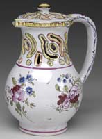 SEVEN PIECES OF EARLY GLASS. 1) Bird water bottle in cobalt blue with a string rim and double ball top and a separately attached spout to fit between the bars of a bird cage. 2) Bird water bottle in clear and cobalt blue. Body is blown into a dip mold creating eight ridges, a 1-1/4″ dia cobalt blue glass ball is attached to the top. The separately attached spout is clear with a cobalt blue rim around the top. 3-4) Pair of early 19th Century European milk glass and polychrome enamel decorated salt and pepper shakers. Bottles are blown with a polished pontil. The screw-on glass heads have six holes each for dispensing their contents. One has an enamel medallion with a “S” presumably for salt; the other has an enamel medallion with a “P” for pepper. Probably once part of a larger set. 5) Single case bottle of triangular form with cut flower decoration on each face. Free-blown with a ground pontil, stopper missing. 6) Late 18th to early 19th Century blown barrel form tankard with a heavy rough pontil. Body of tankard is decorated with applied threading that is mostly intact. Separately applied strap handle is undamaged. 7) Early 19th Century Continental whimsy/tankard. A bulbous body tankard with applied foot and applied handle. Entire item is free-blown and hand tooled. A floral and rigaree type decoration is separately applied to the interior base. SIZE: Tallest is 8-1/4″. Widest is 5-1/2″ at handle. PROVENANCE: From the Collection of Dorothy-Lee Jones. CONDITION: All items are very good to excellent with no major flaws. 5-63113 (600-800)