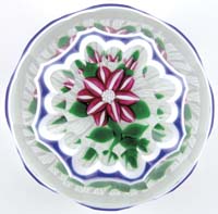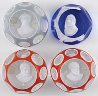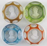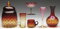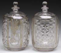 FOUR SUGAR BOWLS. 1) 5-1/4″ blown pattern molded clear sugar with lid. Body of sugar and lid have a molded diamond design throughout. Bowl has a small foot applied to the base, lid has an applied finial. 2) 4″ cobalt blue free-blown Bristol-type open sugar bowl. Separately blown folded type foot attached to bowl. 3) 4-1/2″ cobalt blue English or American free-blown covered sugar. Separately blown folded type foot attached to bowl. Lid is free-blown and hand tooled with separately applied finial. 4) 4″ ruby flashed blown and molded lidded sugar; probably of Bohemian origin. PROVENANCE: From the Collection of Dorothy-Lee Jones. CONDITION: All are very good to excellent. 5-63112 (800-1,200)