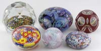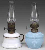 SIX SMALL WHALE OIL LAMPS. 1) Blown base attached to a blown font. No burner present. 2) Blown base attached to a blown font. No burner present. 3) Blown base attached to a blown font with a knopped stem and a single tube drop-in burner. 4) Small free-blown chamber lamp with attached handle. No burner present. 5) Free-blown font attached to a flat pressed base with a knopped stem. No burner present. 6) Free-blown font attached to a flat pressed base with knopped and a single tube drop-in burner. SIZE: Tallest is 4-5/8″. PROVENANCE: From the Collection of Dorothy-Lee Jones. CONDITION: All are very good to excellent with minor flaking around the bottoms of the pressed bases. 5-63140 (600-800)