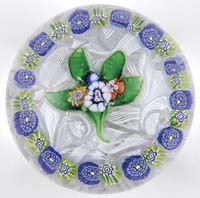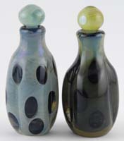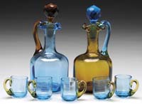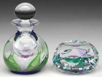 TEN SMELLING SALTS & PUNGENTS. 1) Extremely large form clear snail pungent with ribbed body and applied rigaree to the exterior. 2) Small clear snail type pungent with a ribbed body and a ground top. 3) Early blown ribbed pungent in teal blue-green with a ribbed body and pontiled base. 4) Early blown ribbed pungent in amethyst with a pontiled base and roughness to the lip. 5-10) Smelling salts of various forms; all with pewter caps. Colors include cobalt, opalescent, amethyst, light blue, emerald green and marbled cobalt and white. SIZE: Ranges from 2-1/2″ to 3-1/2″ t. PROVENANCE: From the Collection of Dorothy-Lee Jones. CONDITION: All are very good to excellent with no major flaws. Caps are all complete and functional. 5-63129 (600-1,000)