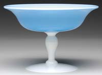 TWO LACY GLASS OPEN SALTS. 1) Neal OP-17 in opalescent dark blue; rated as very rare. 2) Neal CT-1 in opaque blue; rated as very rare. SIZE: Ranges from 3″ to 3-1/2″ w. PROVENANCE: From the Collection of Dorothy-Lee Jones. CONDITION: 1) Is near mint and is far better then what is generally seen. 2) This salt has a wonderful luster and has one minor flake to one corner. An exceptional example. 5-63133 (600-800)