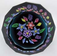 SIX PRESSED GLASS DISHES AND NAPPI. 1) Emerald green flint glass 5-3/4″ plate with a Gothic arch design around the rim and a sixteen square pattern on the base; every other square is decorated with a four petaled flower. 2) Light green flint glass 5-3/4″ plate with a Gothic arch design around the outside and a sixteen square pattern on the base; every other square has a stippled pattern to it. 3) Cobalt blue flint glass 5-3/4″ plate with fourteen circles around the rim of the plate and a central star surrounded by stippled half ovals in the base. 4) Emerald green flint glass 6-1/4″ plate with a stylized bell flower type design around the rim and a pinwheel in the very center of the dish. 5) Cobalt blue flint glass 9″ plate with a stylized foliate design around the edge and a similar design in the center of the plate. 6) Cobalt blue flint glass 5″ nappi on footed base. Nappie has alternate stippled diamond and plain sections to the bowl. Base of foot has eight lobes. Bowl is connected to base with a wafer. PROVENANCE: From the Collection of Dorothy-Lee Jones. CONDITION: Most very good to excellent condition. As with all early pressed flint, small flakes and chips are endemic to the form. The Nappie has severe chipping to the scallops. #3 has a 1″ crack from the rim of one scallop. 5-63109 (500-800)