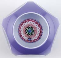 FIVE LACY OPEN SALTS. 1) Neal SD-9 in violet-blue; rated by Neal as rare. There is a noticeable chip on the top edge. 2) Neal JY-2 in light green; rated by Neal as rare. Exceptional condition. 3) Neal CT-1 in silvery-opaque white; rated by Neal as very rare. There is a chip to one corner of the base. 4) Neal OO-26 in dark amethyst; listed by Neal as extremely rare. Superb condition. 5) Another amethyst salt of the lacy period of undetermined pattern. SIZE: 2-3/4″ to 3″ w. PROVENANCE: From the Collection of Dorothy-Lee Jones. CONDITION: All salts are very good to excellent with the usual flakes. If there is more significant damage, it will be noted in the description. 5-63134 (800-1,200)