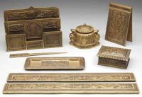 SIX TIFFANY BRONZE DESK ITEMS. Lot consists of two Tiffany zodiac paperweights; one with center zodiac cartouche, the other with a plain cartouche both in brown patina. A Tiffany zodiac stamp box in gold dore. A Heraldic pen tray in brown patina. An unidentified Tiffany pen tray in light brown patina. A round tray in gold dore. Each piece is stamped “Tiffany Studios New York”. The unidentified pen tray and the plain paperweight are not numbered. SIZE: Tray is 9-1/8″ dia. CONDITION: Very good to excellent with minor discoloration to patinas. Stamp box hinge is slightly sprung. 5-63936 (800-1,200)