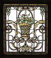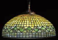 BASKET WEAVE CEILING FIXTURE. Very nice bronze ceiling fixture has basket weave hardware with hinged ring holding a clambroth swirling ribbed glass shade. Unsigned but attributed to Tiffany. SIZE: 16-3/4″ dia x 9″ deep. CONDITION: Very good to excellent. 5-63323 (3,000-5,000)